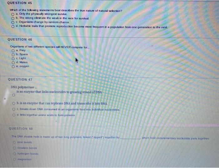 Survival of the fittest. Over the years a bright green algae accumulated in the creek. It does not produce perfection. The process of Natural. Natural selection is based on all of the following EXCEPT-Genetic variation exists within populations-The best-adapted individuals tend to leave the most offspring-Individuals adapt. Random assortment of genes results in better characteristics in the following generations E. For more information about the theory of natural selection please click the links below. Which of the following statements BEST describe the nature of natural selection. The adaptive value of a mutation changes with the ecological circumstances.