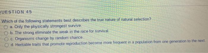 It causes learned skills to become heritable traits. Which sentence best describes the true nature of natural selection. Artificial selection lead to different species in nature. For more information about the theory of natural selection please click the links below. It must act on structural traits. Which statement best explains how this happened. Which of the following statements best describes why this is true.