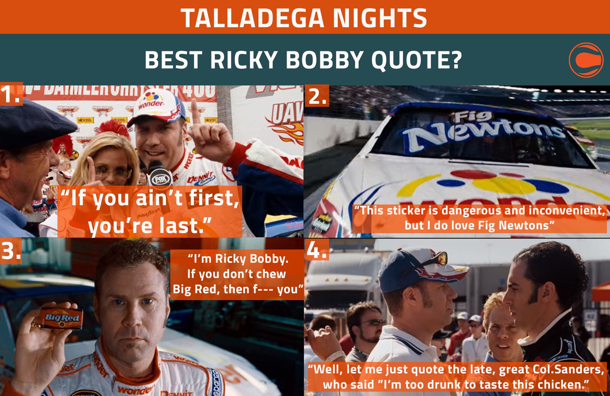 Natural wood or black or white bamboo frames. 226 votes 16 comments. Unique Fig Newtons stickers featuring millions of original designs created and sold by independent artists. Incorrect mistakes and their corrections for Talladega Nights. Ricky Bobby will never be the same after this fateful crashTalladegaNights RickyBobby CrashWatch now on Google Play. Incorrect mistakes and their corrections for Talladega Nights. Shop Ricky Bobby Fig Newton comforters featuring original art of your favorite thing made by artists who love that thing too. High quality Ricky Bobby Fig Newton-inspired gifts and merchandise. Reilly Sacha Baron Cohen Gary Cole.